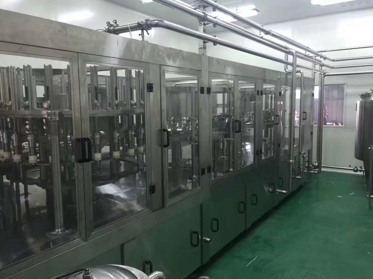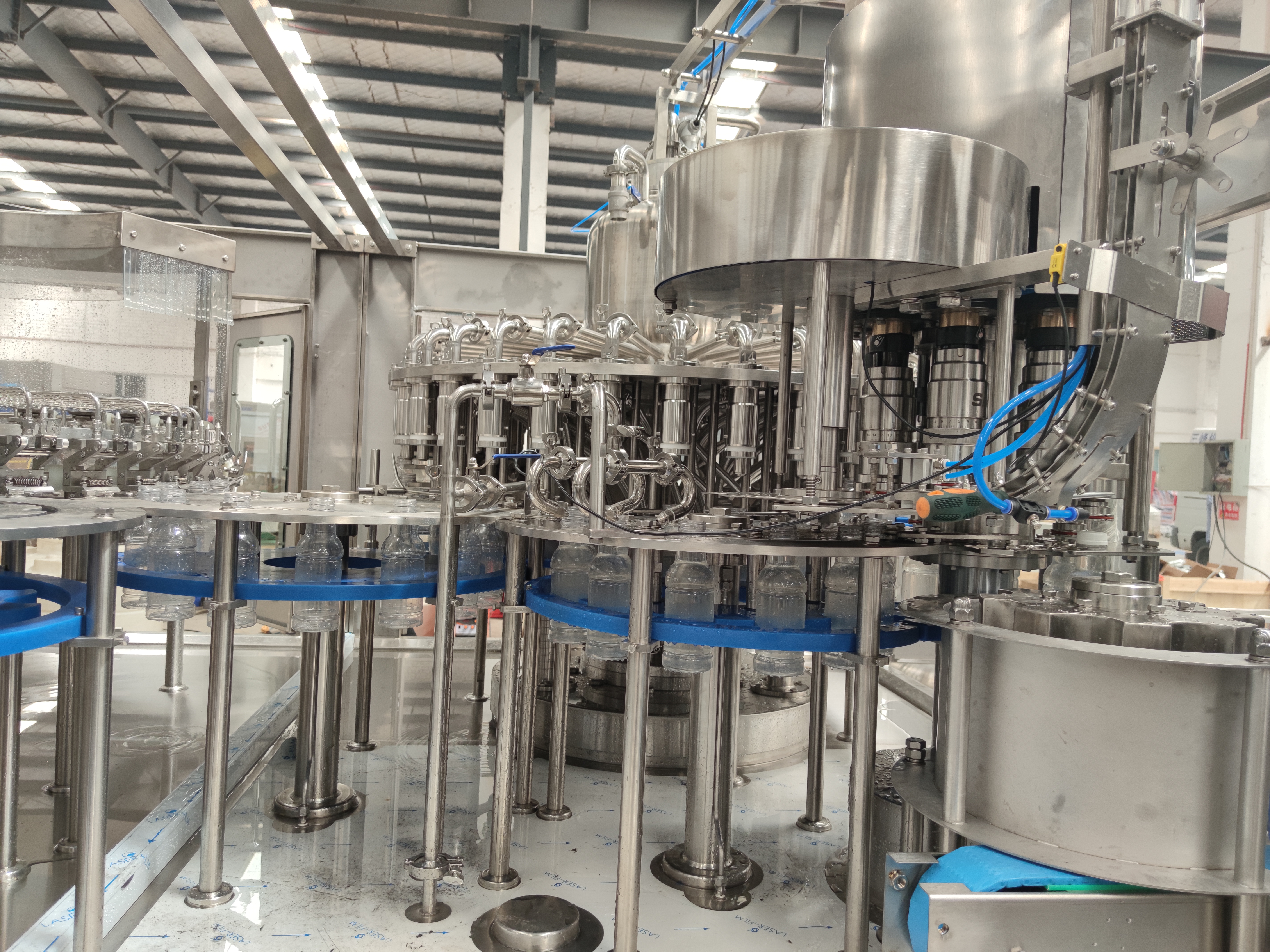 بعد دخول الزجاجة إلى آلة المضيف ، فإنها تدخل شدة الزجاجة من خلال عجلة النقل النجمة ، وتشبك الزجاجة مشابك الفم الزجاجة ويحدث 180 درجة على طول سكة شطف الزجاجة ، بحيث يكون فم الزجاجة لأسفل. في منطقة محددة من آلة الشطف (التي تحددها لوحة توزيع المياه - يتم ضخ المياه الشطف في لوحة توزيع المياه بواسطة مضخة المياه الشطف ، ثم يتم توزيعها على مشبك الشطف بواسطة لوحة توزيع المياه عبر 24 أنابيب) ، يتم رش فوهة مشبك الشطف من الزجاجة مع الماء إلى حوض الحائط الموجود في الزجاجة. بعد شطف الزجاجة واستنزافها ، يتم الاحتفاظ بها بواسطة حامل الزجاجة وترفض 180 درجة على طول السكك الحديدية المرشد لجعل الفم الزجاجة لأعلى. يتم تصدير الزجاجات المغسولة من آلة شطف الزجاجة من خلال عجلة الصلب الانتقالية (شطف المياه النقية) وإرسالها إلى العملية التالية - ملء.